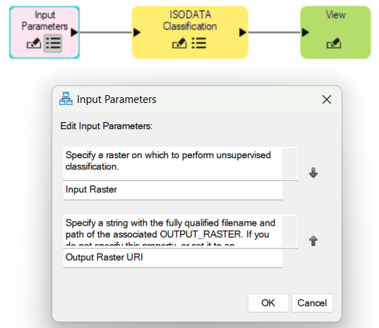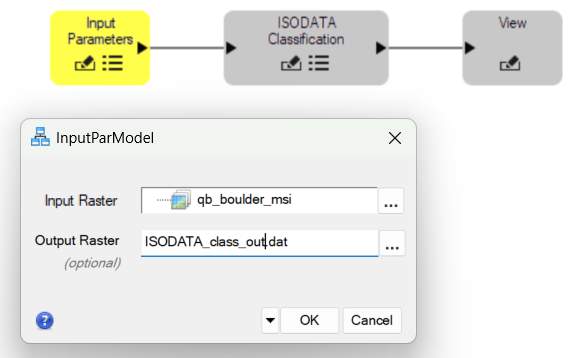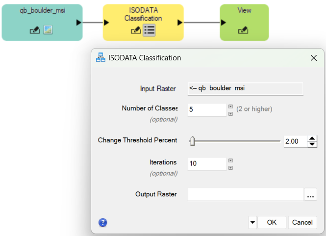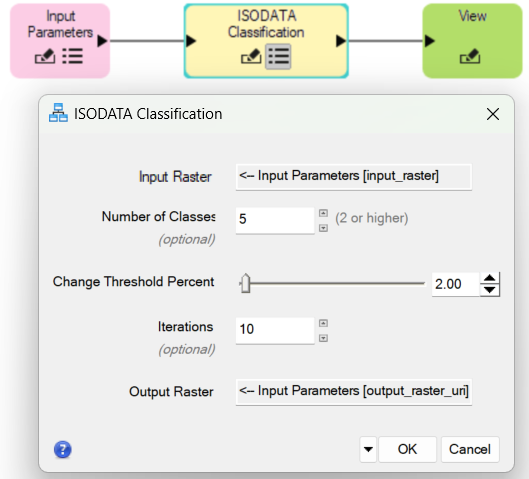 Click the parameters icon on the ISODATA Classification node. Both the Input Raster and Output Raster fields will automatically be filled with the selected fields from the Input Parameters node, as shown below. You can adjust all the other parameters here.