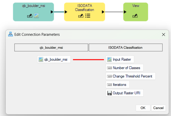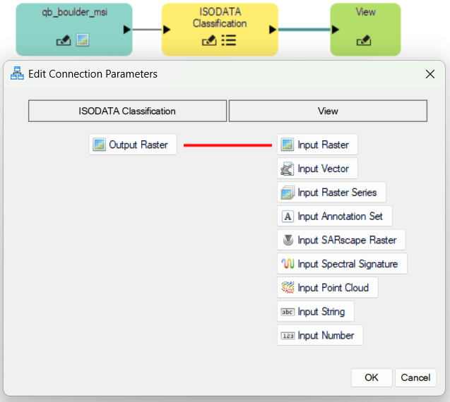 Draw a connector between theInput Parameters node and the ISODATA Classification node. This brings up the Connect Parameters dialog.