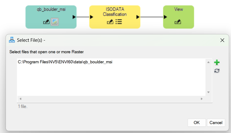Now you must connect the nodes. When you hover over a right or left arrow on a node, your mouse changes to a crosshair symbol. Hover over the right arrow on the qb_boulder_msi node until you see crosshairs, then left click and drag the dashed line that appears onto the left side arrow of theISODATA Classificationnode. If a connection is valid, the dashed line becomes solid, and you can release the click. You now have a solid connector line between the File and Task nodes. 4. 9