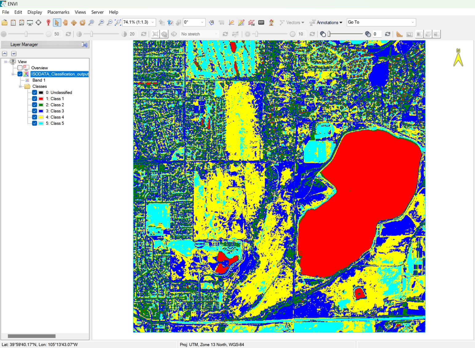 Minimize the ENVI Modeler window and to to the ENVI Image window. The classification output from the model is displayed, as shown below: