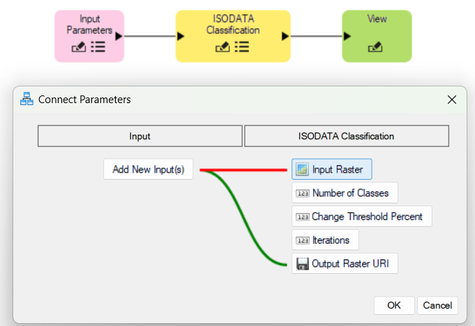 - 在 输入参数(Input Parameters) 节点和 ISODATA 分类(ISODATA Classification) 节点之间绘制一个连接器。这将弹出 连接参数(Connect Parameters) 对话框。