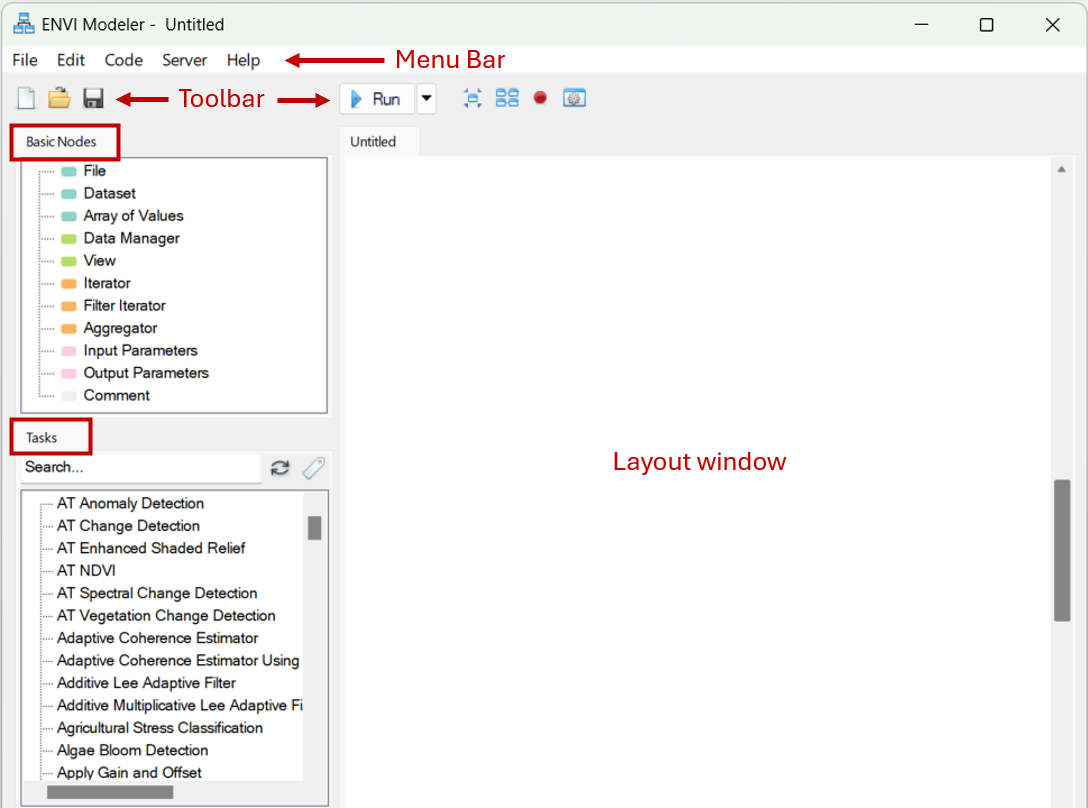 The Modeler user interface—shown in the figure below—contains a menu bar, toolbar, a window containing "Basic Nodes," a window containing the "Tasks," and a Layout Window where you will build and/or visualize the models: