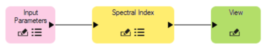 The following figure shows an example model with a pink "Input Parameters" Basic node that creates an output, connected to a yellow "Spectral Index" Task node that accepts inputs and creates outputs, which in turn connects to a green "View" Basic node that accepts an input.
