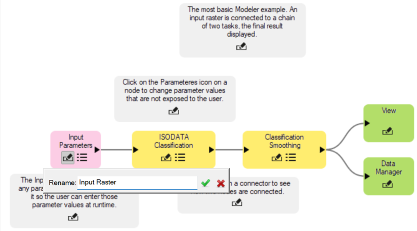 The Simple Model example contains a pink Input Raster node, connected to a yellow ISODATA Classification Task node, connected to a Classification Smoothing Task node, in turn connected to two green output nodes: View and Data Manager. This model also contains 4 grey Comment nodes, which describe the model, the purpose of the Input Parameter node, and provide tips on interacting with task nodes and connections between nodes.