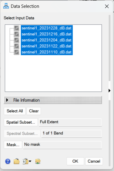 Since your five Sentinel-1 rasters are already open in ENVI, they will show up under Select Input Data. You can click the Select All button to select all. If your files are not already loaded into ENVI, you can click the Open File icon to navigate to the directory where you saved the data and open the files from there.