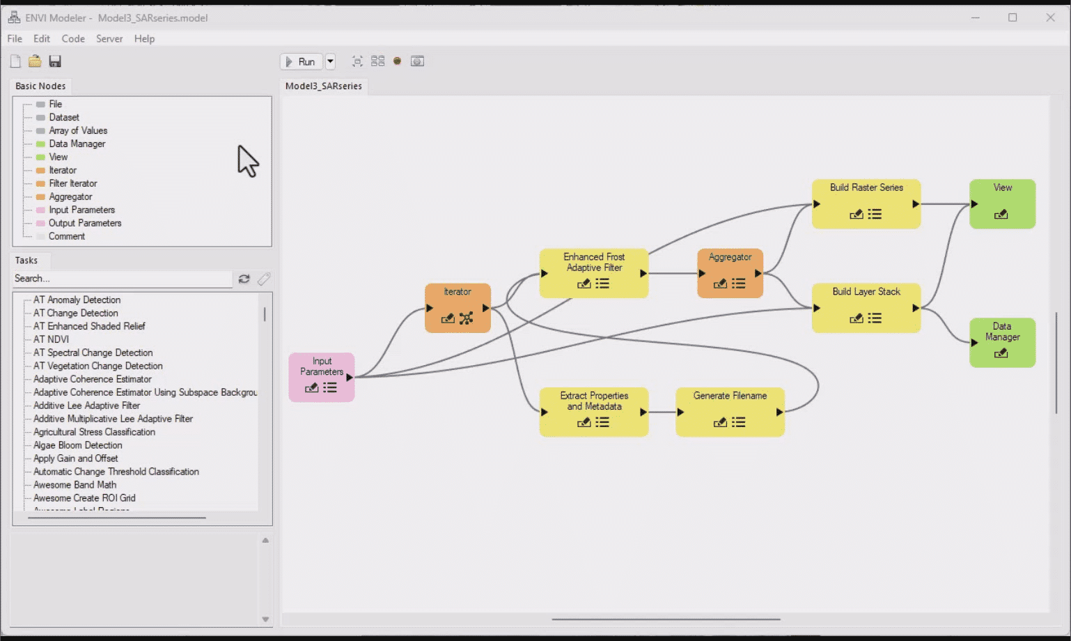 This model accepts an Input Raster using the pink Input Parameters node, which it feeds to the Enhanced Frost Adaptive Filter node. It also uses an Array of Valuesnode (cyan) that has been set to values of 3, 6, and 9. These will be the window sizes that we loop through for the Filter task. Using the Iterator node between the Array of Valuesand Enhanced Frost AdaptiveFiltertask node ensures that the task will be ran once using each of those values as the chosen window size. We have an additional task node, Generate Filename, which ensures that the output of each iteration has the window size value appended to the filename so we can keep track of which output is which.