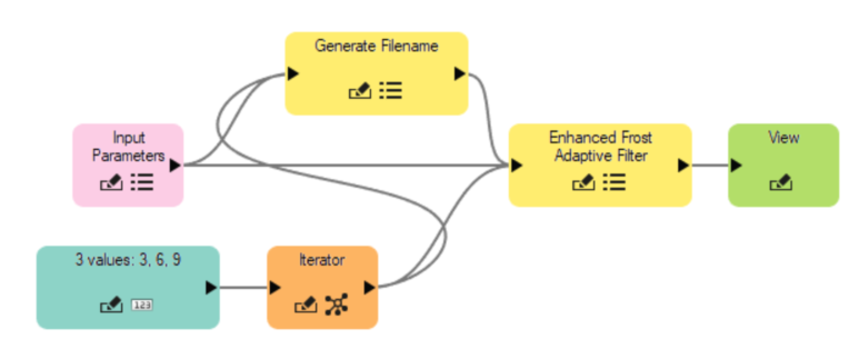 In this example, we will illustrate how to import all five Sentinel-1 rasters and apply the Enhanced Frost Filter, making use of an Iterator node. The procedure is similar to that for the previous model, but this time you do not need an Array of Values node.