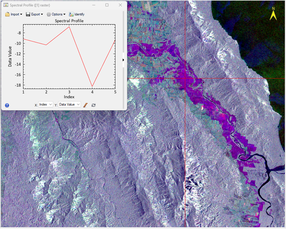 If you click on a pixel in the flooded area, you will see that Index 4, corresponding to the flood date of December 16, 2023 has the lowest Intensity (around -15 to -20 dB), as shown in the image below: