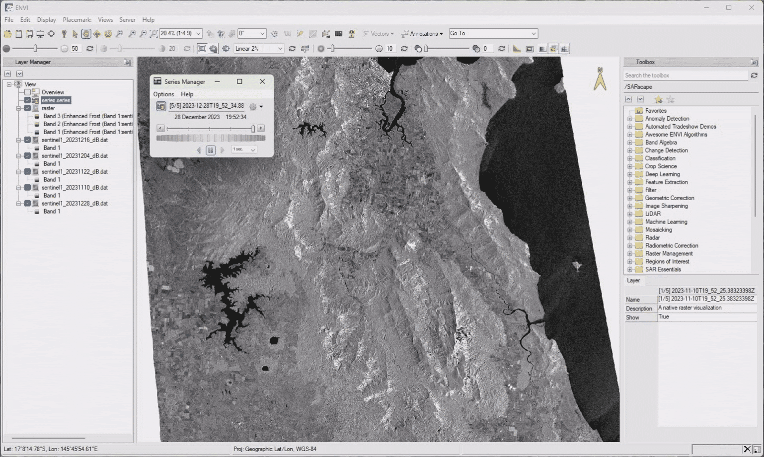 You can use the Series output to visually inspect these changes over the five dates. Notice the appearance of dark (low backscatter) pixels around the rivers on the December 16, 2023 image, due to the floods.