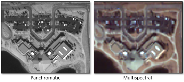 全色影像包含一个具有宽光谱覆盖范围的波段:450 到 900 nm。你可以看到其中的权衡:低光谱分辨率与高空间分辨率。全色影像通常用于侦察和详细的视觉观测,而不是分析地表物质的光谱特性。