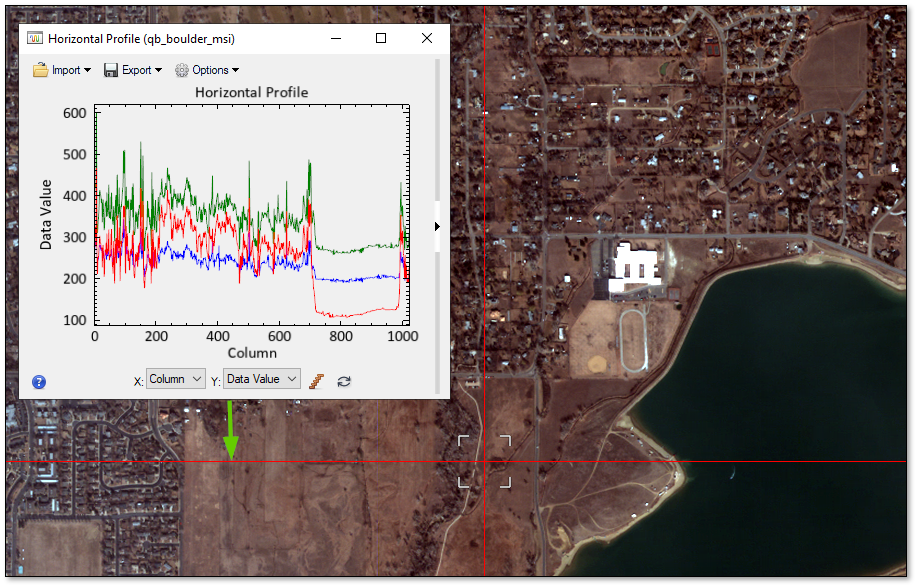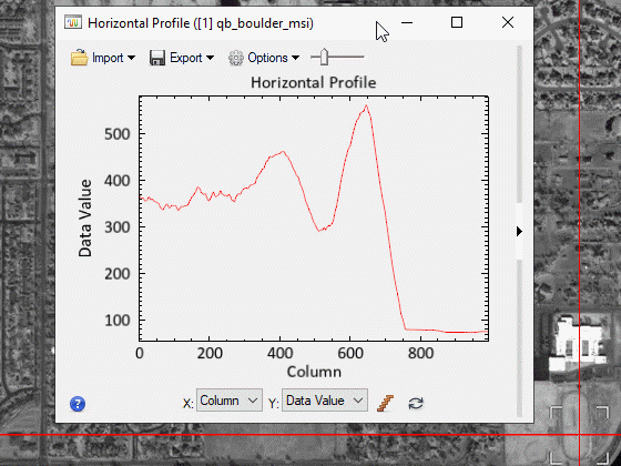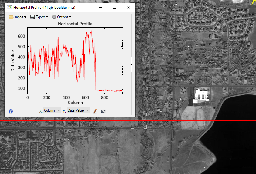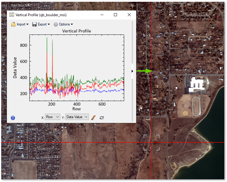Display horizontal and vertical profiles of data across a QuickBird image. * •