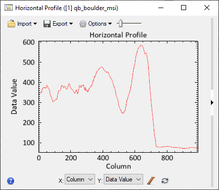Select Display > Profiles > Horizontal from the Menu bar. The Horizontal Profile plot window appears, and red crosshairs are displayed in the Image window. Again, the plot shows data values from the near-infrared band along the horizontal line in the crosshairs.