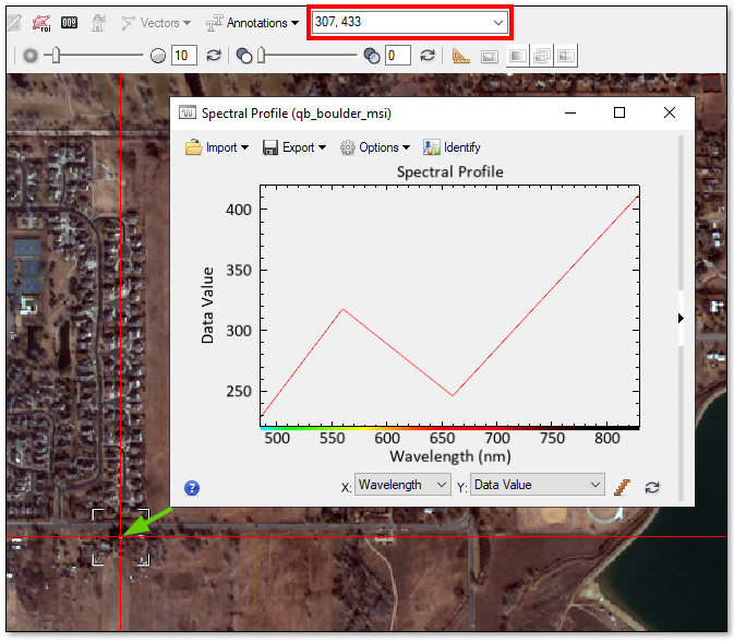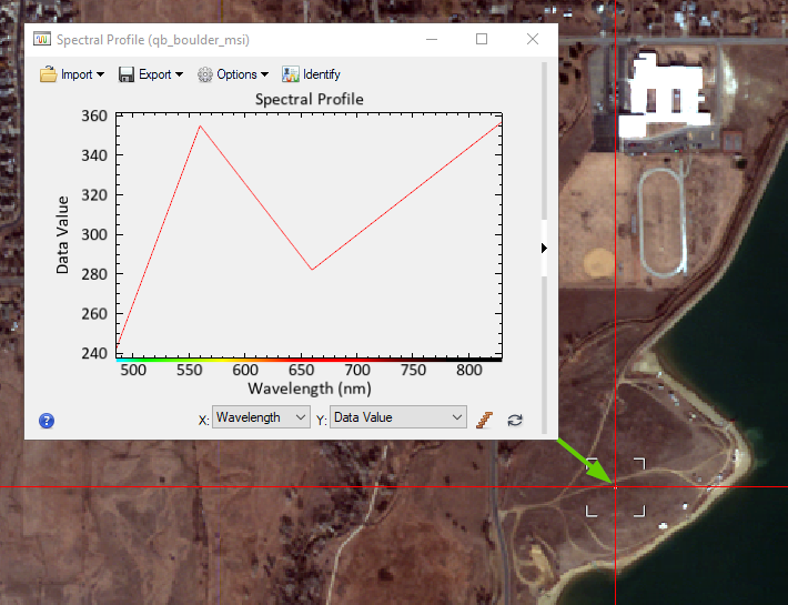 The following steps demonstrate how to plot the spectra of individual pixels across all bands in the QuickBird image. A spectral profile (sometimes called a z profile) plots spectral information from the whole file and not just the bands displayed on the screen.