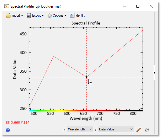 Click anywhere along the red curve in the Spectral Profile. Dashed crosshairs center on the nearest data point of the curve. Red text appears in the lower-left corner of the Spectral Profile. The number in brackets is the band number associated with the selected data point. The X value is the center wavelength, in nanometers. The Y value is Data Value.