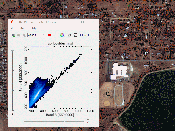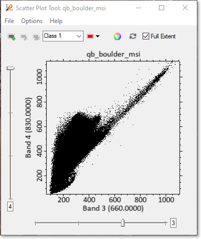 Compare the near-infrared band with the red band. To do this, drag the Y-axis slider to Band 4 and keep the X-axis slider at Band 3.