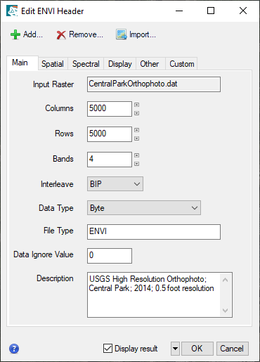 Click OK to dismiss the Edit ENVI Header dialog. The image closes and reopens while the associated header file (CentralParkOrthophoto.hdr) is updated with the new metadata.