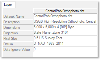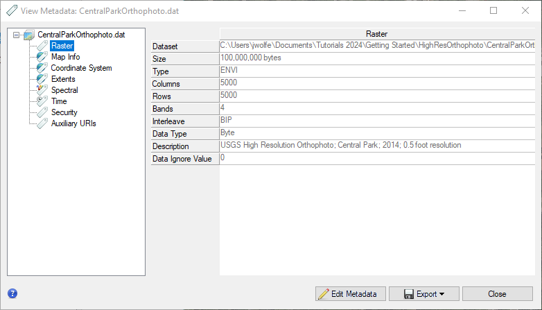 In the Layer Manager, right-click on CentralParkOrthophoto.dat layer and select View Metadata. The View Metadata dialog appears. Here you can view the full set of metadata for the orthophoto. The Raster tag shows most of the same metadata as the Property Sheet.