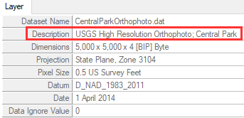 Change the description to "USGS High Resolution Orthophoto; Central Park," omitting the date and resolution. 3. 11