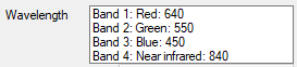 Click the Spectral tab. The Wavelength field lists the band names and their associated center wavelengths. The original image downloaded from the U.S. Geological Survey (USGS) EarthExplorer(opens in a new tab) site did not contain wavelength metadata, only band names. We used the Edit ENVI Header tool to add the peak wavelengths you see here. For the near-infrared band, we used the center wavelength (840 nm).