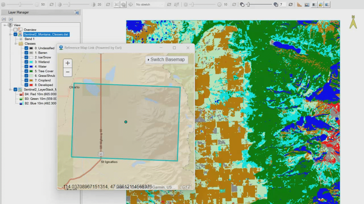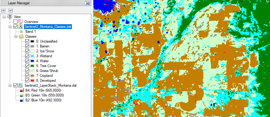 In the Layer Manager, uncheck and check the Sentinel2_Montana_Classes.dat layer on and off to compare it with the Sentinel-2 multispectral image.