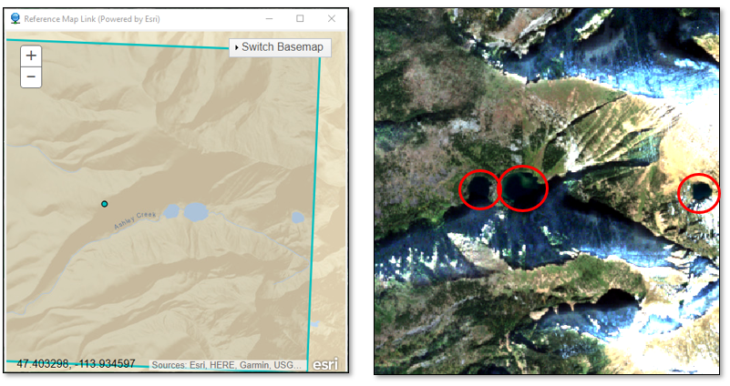 From the ENVI Menu bar, select Views > Reference Map Link. The Reference Map Link dialog appears. The cyan-colored dot in the middle corresponds to the center of the Sentinel-2 image. The example below shows three lakes that exist in the area, according to the base map. They are circled red in the Sentinel-2 image: