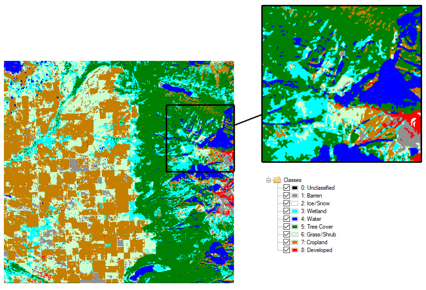 Throughout the scene, you will notice areas that are incorrectly classified. An example is the mountainous region on the right side of the image, which contains an abundance of "Water" (blue) and "Wetland" (cyan) class pixels. In reality, the mountains do not contain large bodies of water or wetland areas. The classifier mistook shadowed areas as "Water." It also confused "Wetland" with "Grass/Shrub" (light green).