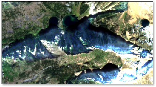 For this example, let's change "Water" pixels to a different class in the mountainous region. Some lakes do exist in this area, so you must identify the real water bodies. Pan and zoom to the mountainous region shown below, which is located on the right side of the image. You cannot really tell whether the dark pixels in the Sentinel-2 image are shadow or water.