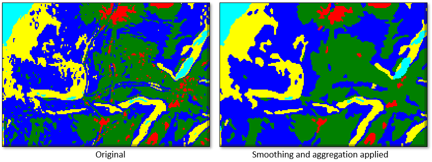 The Cleanup panel is displayed next. Cleanup is recommended if you plan to save the classification vectors to a file in the final step of the workflow. Performing cleanup significantly reduces the time needed to export classification vectors. This step of the workflow uses smoothing and aggregation operations. Smoothing reduces speckling noise. Aggregation removes small, isolated regions of pixels. The following images show an example from a subset of the classification image:
