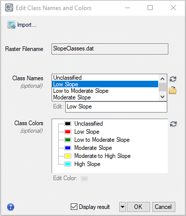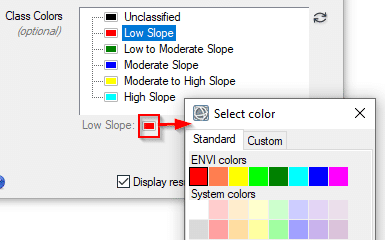 Click OK in the Edit Class Names and Colors dialog to update the class names and colors. The changes are written to the associated ENVI header file (SlopeClasses.hdr). The next time you load this image into ENVI, the new names and colors will be retained.