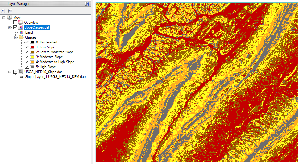 Click the Finish button. The slope classification image is added to the Layer Manager and displayed in the Image window.