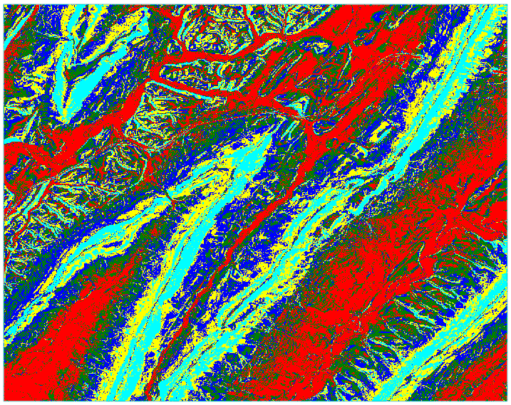 Uncheck and check the Unsupervised Classification layer in the Layer Manager to compare the classification image with the underlying slope image. You should be able to tell that the cyan-colored class (#5) represents areas with the steepest slopes. The red class (#1) corresponds to flat areas. There are no Unclassified pixels in this image.
