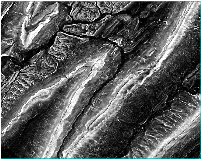 较亮的像素值表示更陡峭的坡度。深色像素表示坡度很小或没有坡度的区域。