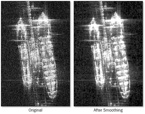 When processing is complete, the smoothed image is added to the Layer Manager and displayed in the Image window. The following screenshot shows the effect of smoothing on two ships docked at the harbor: