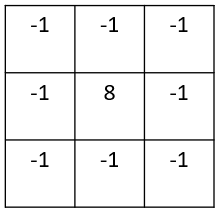 High-pass filters are a type of convolution filter in which the brightness value at a given pixel is a function of some weighted average of the brightness of the surrounding pixels. They remove the low-frequency components of an image while retaining the high-frequency components. They use a kernel with a high central value, typically surrounded by negative weights. ENVI’s default high-pass filter looks like this: