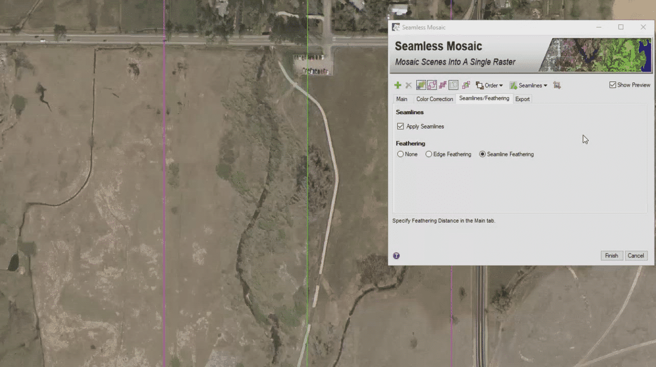 You have two options for reducing the hard edge between overlapping scenes: (1) enable edge feathering or (2) add seamlines. You can only choose one method. For this exercise, you will add seamlines.