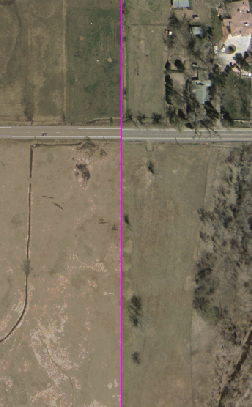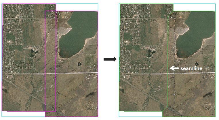 Click the Seamlines drop-down list and select Auto Generate Seamlines. When processing is complete, a green seamline is displayed. The following figure on the right shows the result with the magenta footprint boundaries hidden. The seamline is drawn halfway through the overlap area.