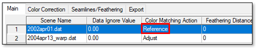 Right-click in the table cell that says "Adjust" and select the Reference option. The 2002apr01.dat scene is now the reference scene. Its histogram will be used as the basis for changing the color and tone of the other scene (the adjusted scene).