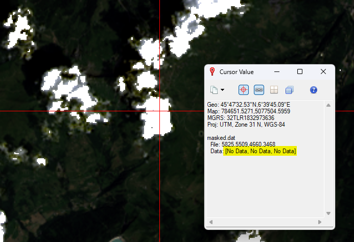 Use the Cursor Value tool to verify that the masked pixels are labeled "No Data".