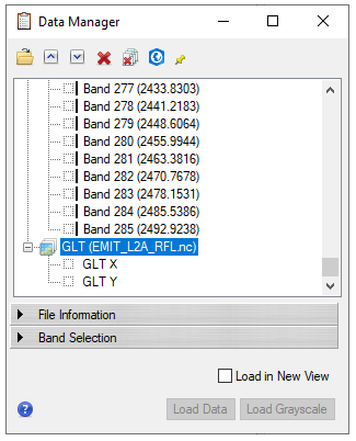Not all GLT information is structured the same way. Georeferencing steps may vary, depending on the dataset. ENVI automatically reads the GLT grids in EMIT NetCDF-4 files and puts them in the Data Manager for easy access. Other NetCDF and HDF datasets that contain GLT information may require you to use the Dataset Browser to extract GLT X and Y grids and build a new raster from them. See the Build Geographic Lookup Tables (GLTs) From Input Geometry quick guide for details.
