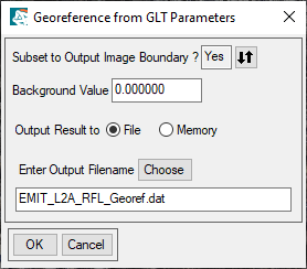 Select the first EMIT_L2A_RFL.nc dataset and click OK. This is the reflectance image. The Georeference from GLT Parameters dialog appears. 3. 6