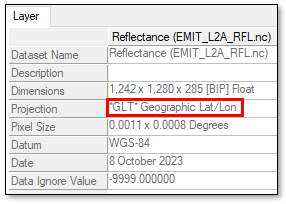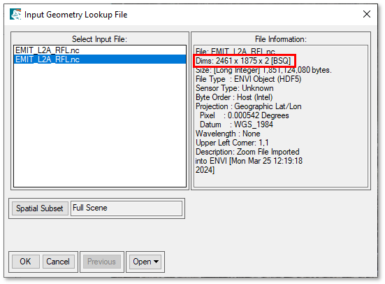 Select the second EMIT_L2A_RFL.nc dataset. The "Dims" field on the right side should say 2461 x 1875 x 2 [BSQ]. The "2" indicates that the dataset contains two bands (GLT X and GLT Y).