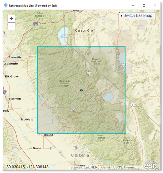 From the Menu bar, select Views > Reference Map Link. A window appears, showing the geographic location of the image over central California.