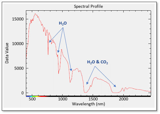 The straight line from about 1,800 to 1,900 nm represents missing reflectance data, i.e., the bands that were excluded from the reflectance image. Also notice the gap from 1,350 to 1,400 nm. This corresponds to Bands 129 to 136 that were excluded from the reflectance image, plus an additional band (137) that QUAC automatically identified as bad.