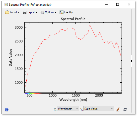 Right-click on Reflectance.dat in the Layer Manager and select Profiles > Spectral. The Spectral Profile dialog appears, and red crosshairs appear in the Image window. The reflectance curve looks different than the radiance curves you saw in the previous exercise; for example: