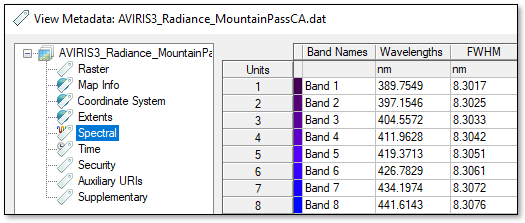Click the Spectral category on the left. A table shows the center wavelengths for each band. The "FWHM" column lists the full width half maximum values that NASA provided for the AVIRIS-3 file.