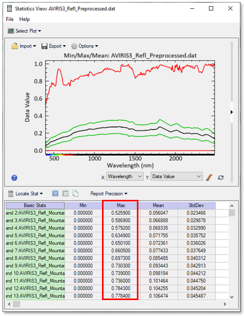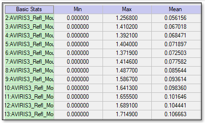 In the Layer Manager, right-click on AVIRIS3_Refl_Preprocessed.dat and select Quick Stats. The Statistics View dialog appears. 7. 12