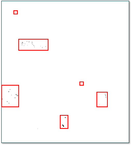 Click Open. The mask is added to the Layer Manager and displayed in the Image window. Most of the mask image have pixels with a value of 1 (white). When you apply the mask to the scaled reflectance image, those pixels will retain their original values. The black pixels in the mask correspond to pixels in the reflectance image whose values were above 1. Those pixels are circled in red below. They are mostly associated with highly saturated pixels over white buildings and vehicles.