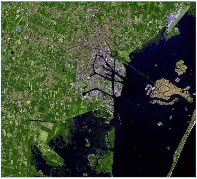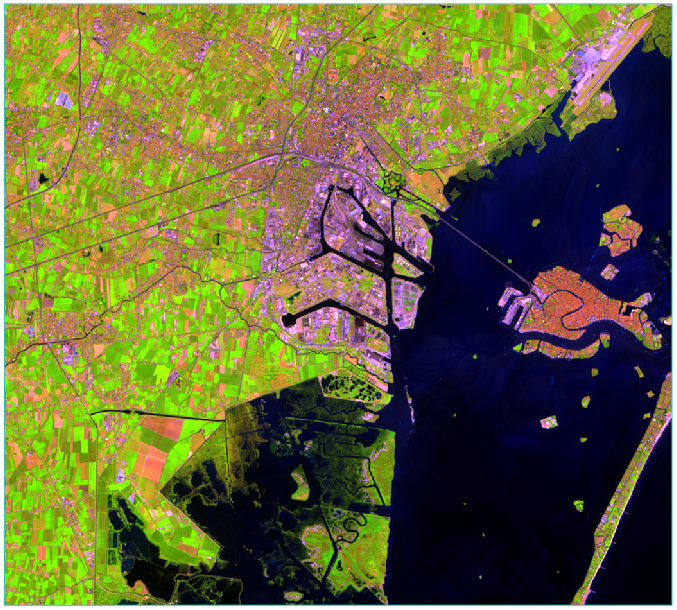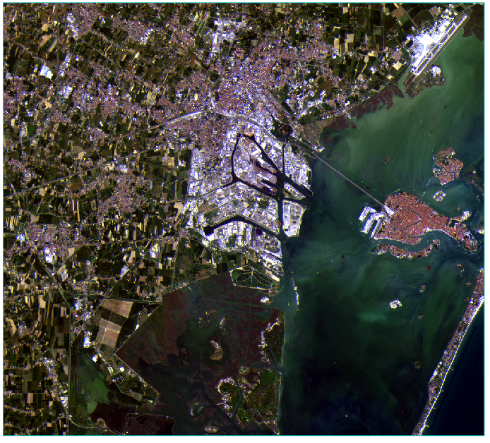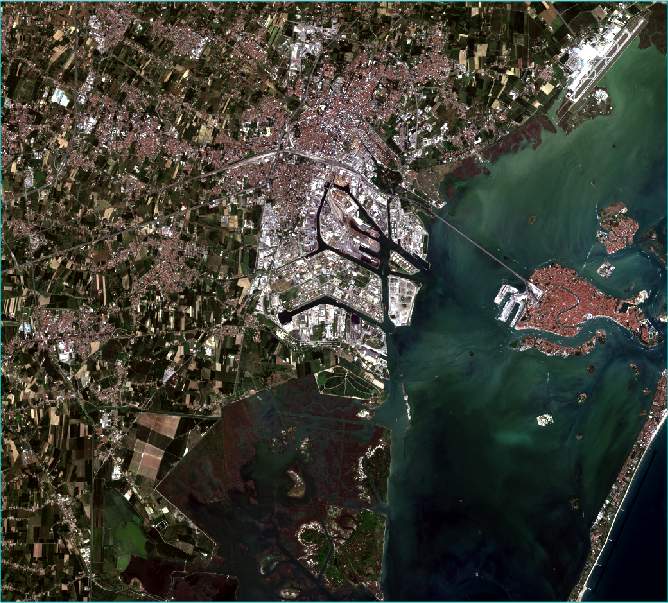 Press the F12 key on your keyboard to view the full extent of the image. This Sentinel-2 multispectral image is centered around Porto Marghera in eastern Italy. The small island to the east is Venice. This image was acquired on August 13, 2015. Sentinel-2 images are available from the Copernicus Data Space Ecosystem(opens in a new tab) website.