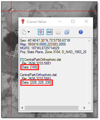 Click anywhere in the image. The red crosshairs move to that pixel location, and the Cursor Value dialog reports the data values from the grayscale image layer and the true-color layer for that pixel.