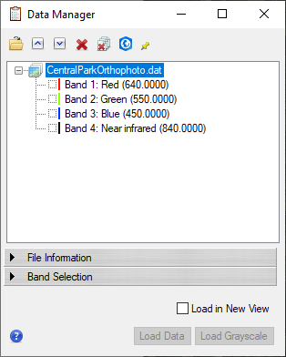 The Data Manager lists the datasets that are currently open in ENVI. For images, it also lists the available bands. Since the associated header file for this image (CentralParkOrthophoto.hdr) contains wavelength information, the Data Manager also lists the wavelengths for each band.